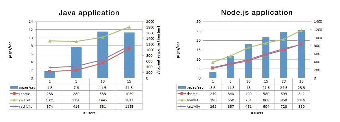 PayPal has an interesting story of how they migrated from Java to Node.js which provided the site an 100% increase in business availability, even with huge load. After using Node.js, in its backend, PayPal experienced a 35% decrease in the average response time for the page which made the startup time 200ms faster.